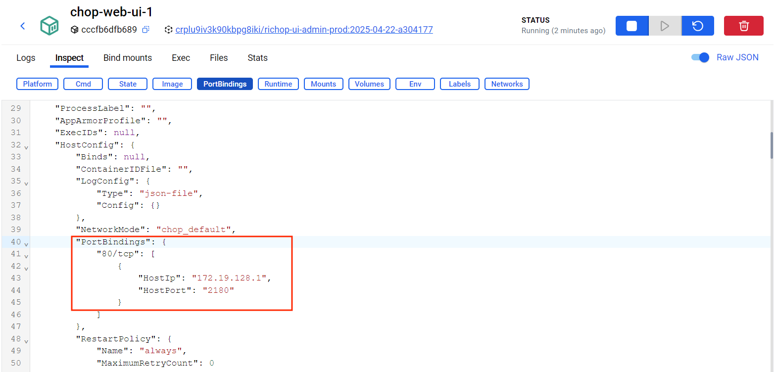 2. Перейдите в контейнер chop-web-ui-1 → вкладка Inspect → PortDlinding