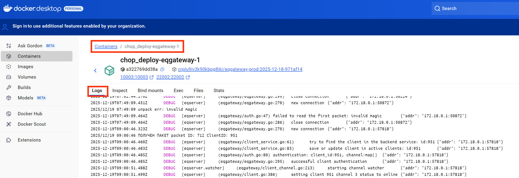 3. Логи контейнера eqgateway-1