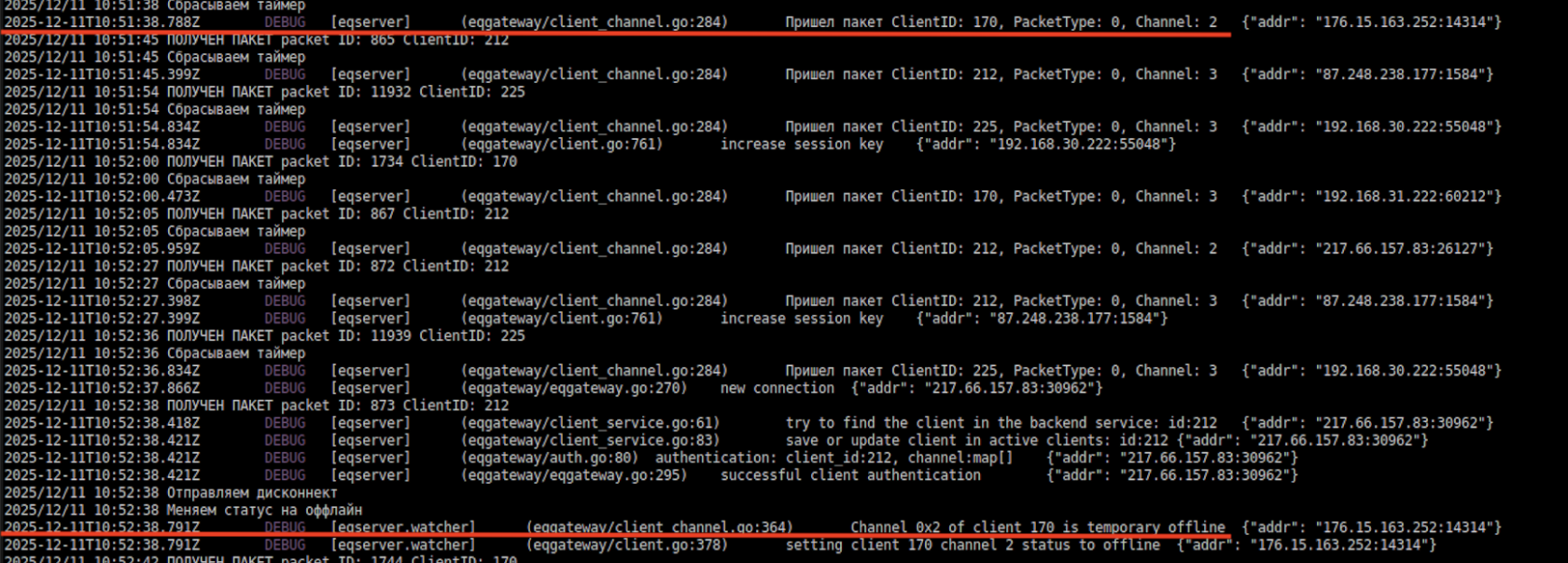 2025-12-11T10:52:38.412Z DEBUG [eqserver] (eqgateway/client_service.go:61) try to find the client in the backend service: id:212 {"addr": "217.66.157.83:30962"}