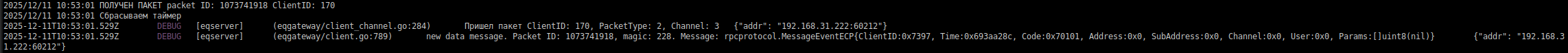 5 | 2025-12-11 10:53:01 | Отправляем пакет с messageID: 29591 | Пакет расшифрован в eqgatteway и отправлен в очередь сообщений, контейнер rabbitmq-1 |