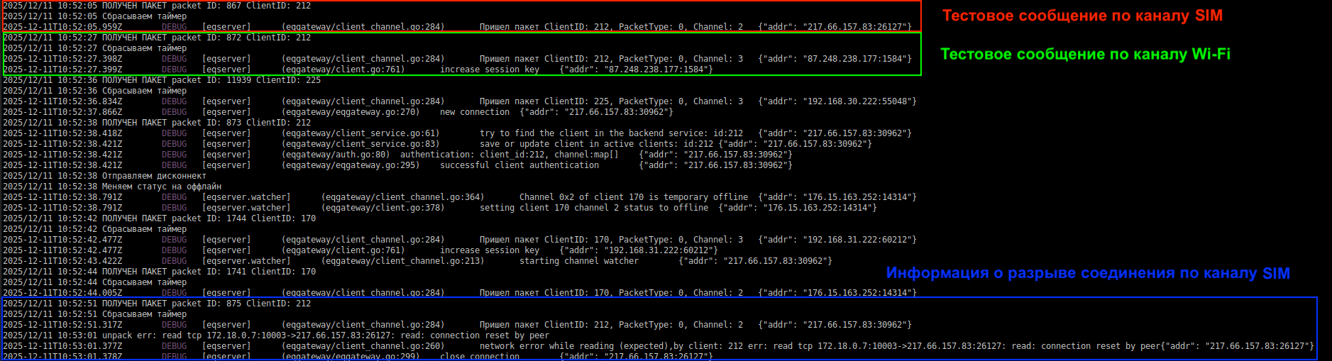 4 | 2025-12-11 10:53:01 | unpack err: read tcp 172.18.0.7:10003 -> 217.66.157.83:26127: read connection reset by peer | Разрыв удаленного соединения. Удаленная сторона (IP: 217.66.157.83) аварийно разорвала TCP-соединение в тот момент, когда функция внутри контейнера eqgateway (IP 172.18.0.7) пыталась прочитать данные из установленного ранее соединения. |