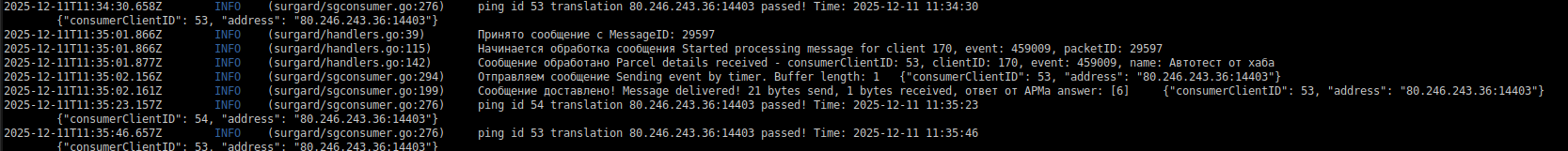 6 | 2025-12-11T11:33:35.02.161Z | Сообщение доставлено! Message delivered! 21 bytes send, 1 bytes received, ответ от АРМа answer: [6] {"consumerClientID": 53, "address": "80.246.243.36:14403"} | Сообщение доставлено успешно. ХХ bytes send - отправлено ХХ байт 1 bytes received - получен ответ |