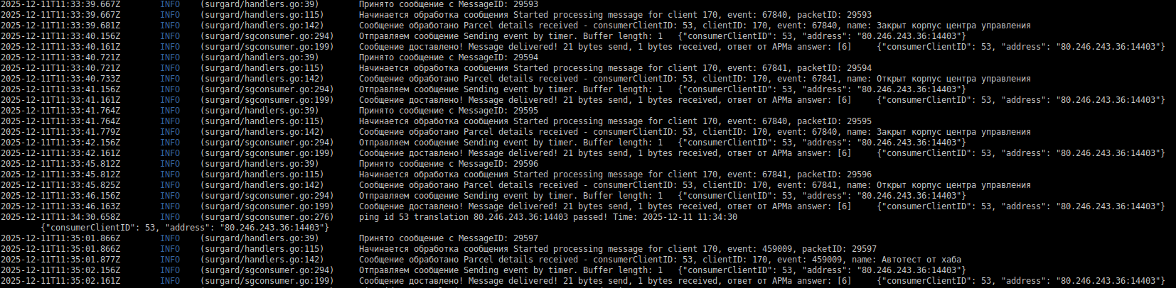 5 | 2025-12-11T11:33:35.02.156Z | Отправляем сообщение Sending event by timer. Buffer length: 1 {"consumerClientID": 53, "address": "80.246.243.36:14403"} | Отправка сообщения в ПЦН. address - внешний IP-адрес и порт сервера ПЦН |