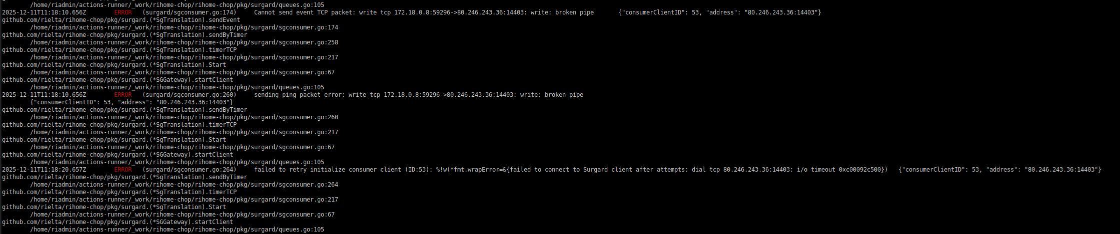 INFO ... Surgard connection established {"consumerClientID": 53, "address": "80.246.243.36:14403"}