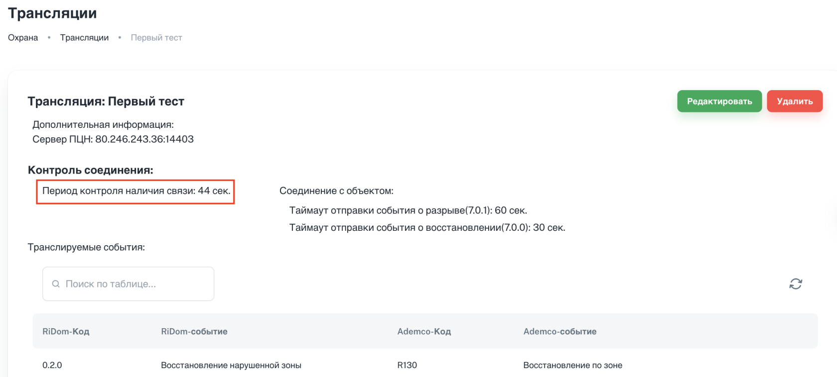 1 | 2025-12-11T11:33:34.30.658Z | ping id 53 translation 80.246.243.36:14403 passed! Time: 2025-12-11 11:34:30 | Контроль наличия связи с ПЦН. id - номер трансляции translation - внешний IP-адрес и порт сервера ПЦН |