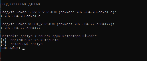 2. Ввести текущие настройки RiCoder в блоке Ввод основных данных (язык установки, версии RiCoder, сетевые настройки).