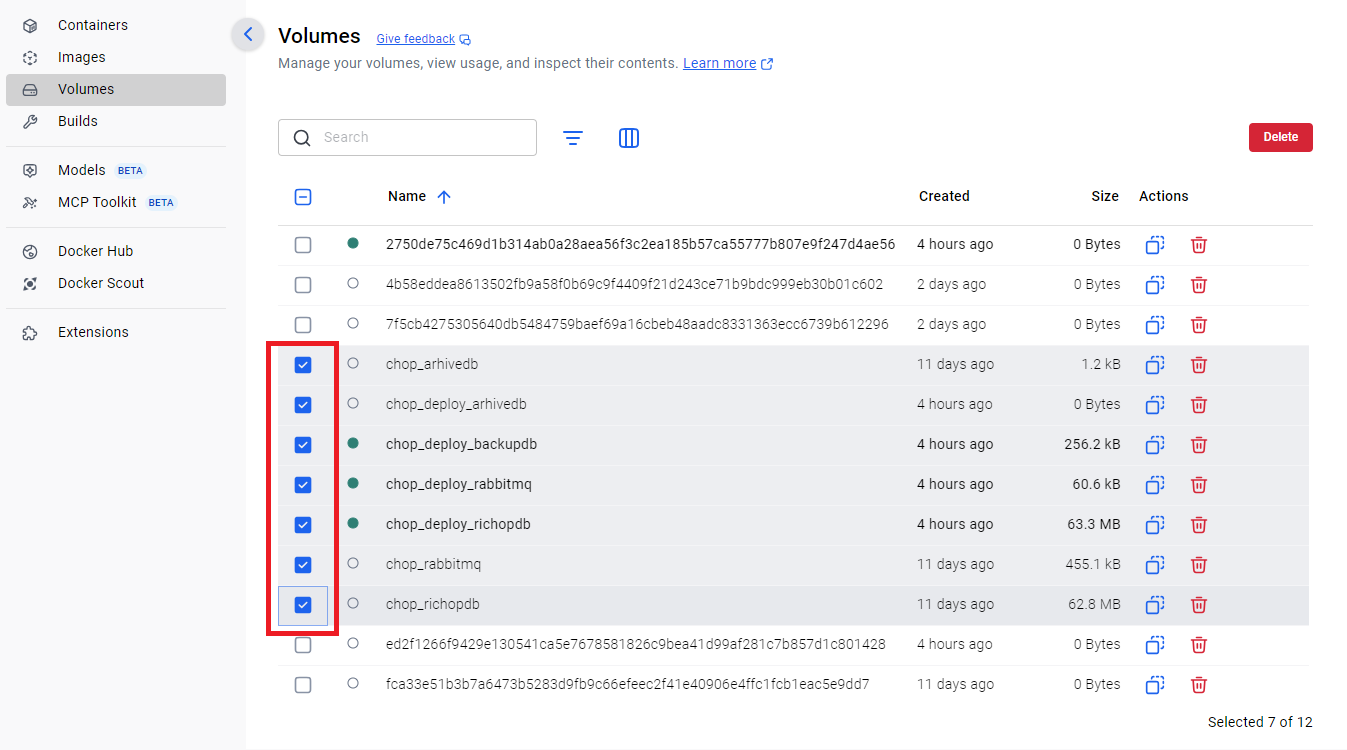 2.4. Выделите все контейнеры с префиксом chop и нажмите Delete (иконка корзина). Будут удалены тома Docker (хранилища данных), связанные с контейнерами RiCoder.