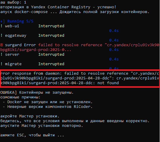 Текст ошибки: Error response from daemon: failed to resolve reference "cr.yandex/crplu9iv3k90bpg8iki/surgard-prod:2025-04-28-ddc": cr.yandex/crplu9iv3k90bpg8iki/surgard-prod:2025-04-28-ddc: not found