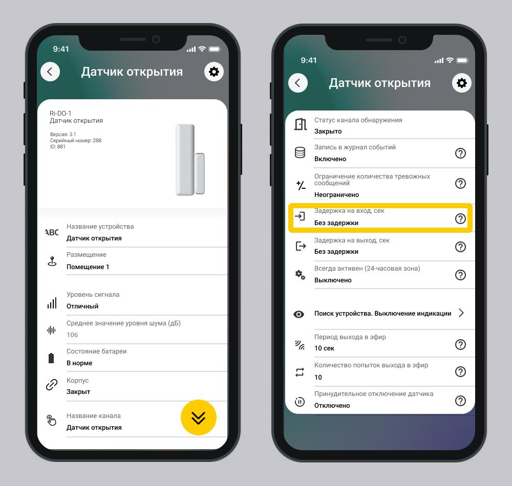 Задержки на вход и выход поддерживаются только датчиками движения Ri-MD-1 и открытия Ri-DO-1.